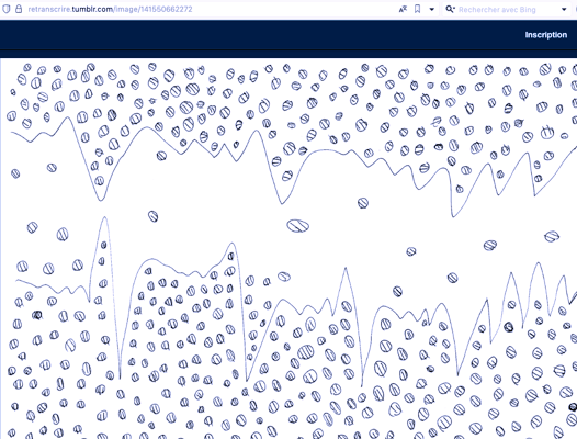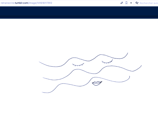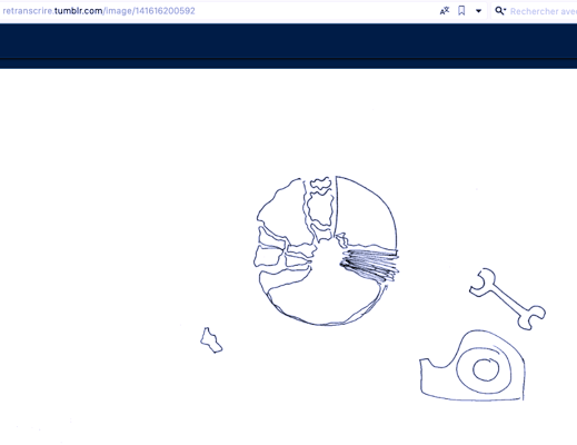L'exemple ici est particulier. La jeune fille partait d'un mot pour effectuer un dessin très succinct. L'expérience a duré un mois et avait pour objectif de l'aider a synthétiser ses idées et a valoriser ses capacités face à une production rapide et efficace. Quelques exemples de sa production pour la page qu'elle a nommé "Retranscrire".