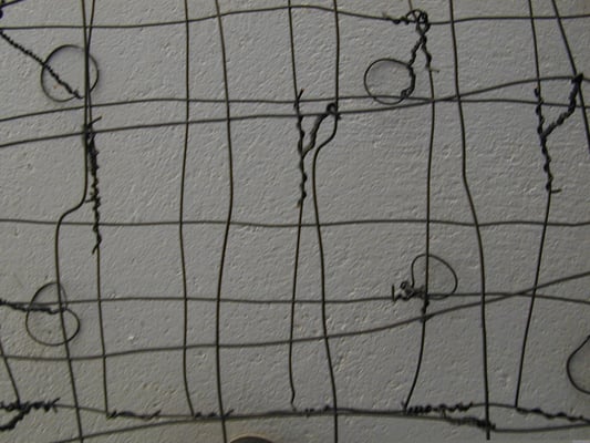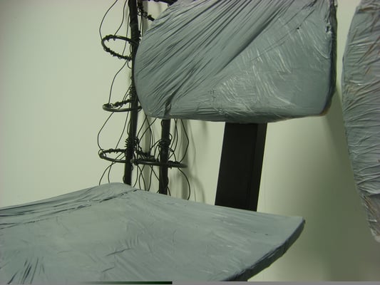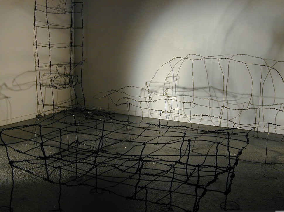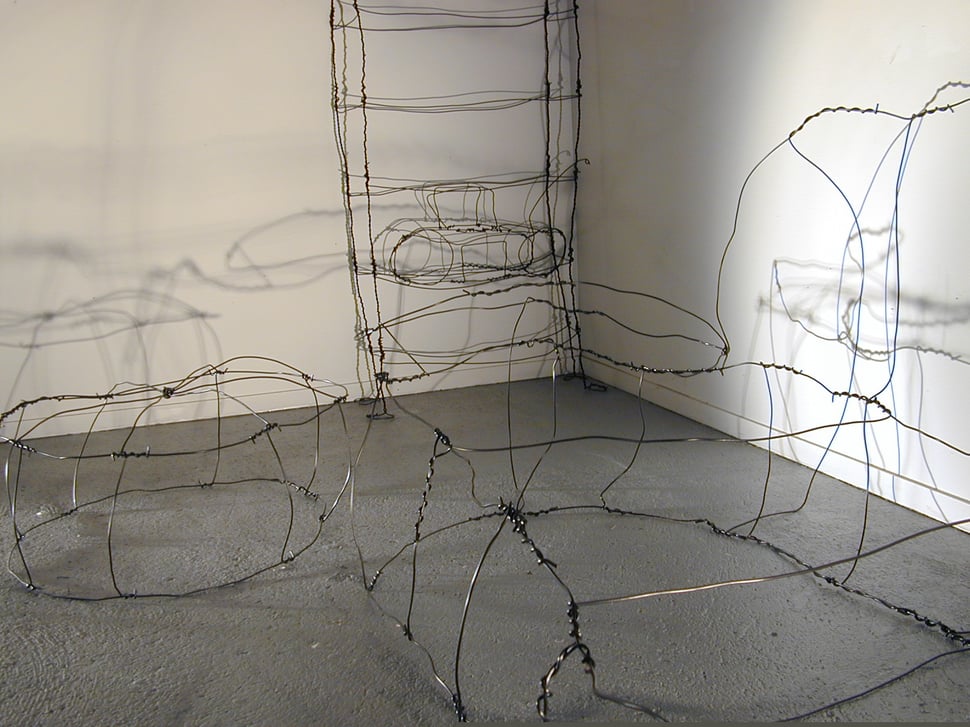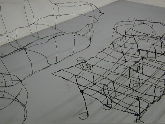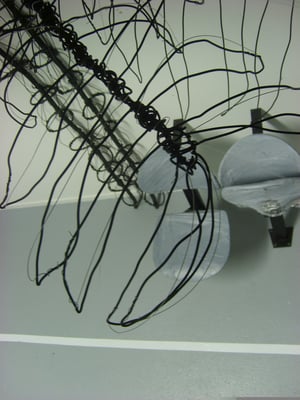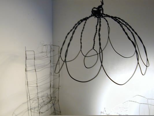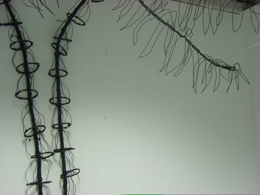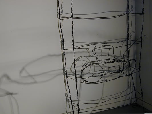 Fil de fer, câble électrique, acrylique, bois, film plastique.